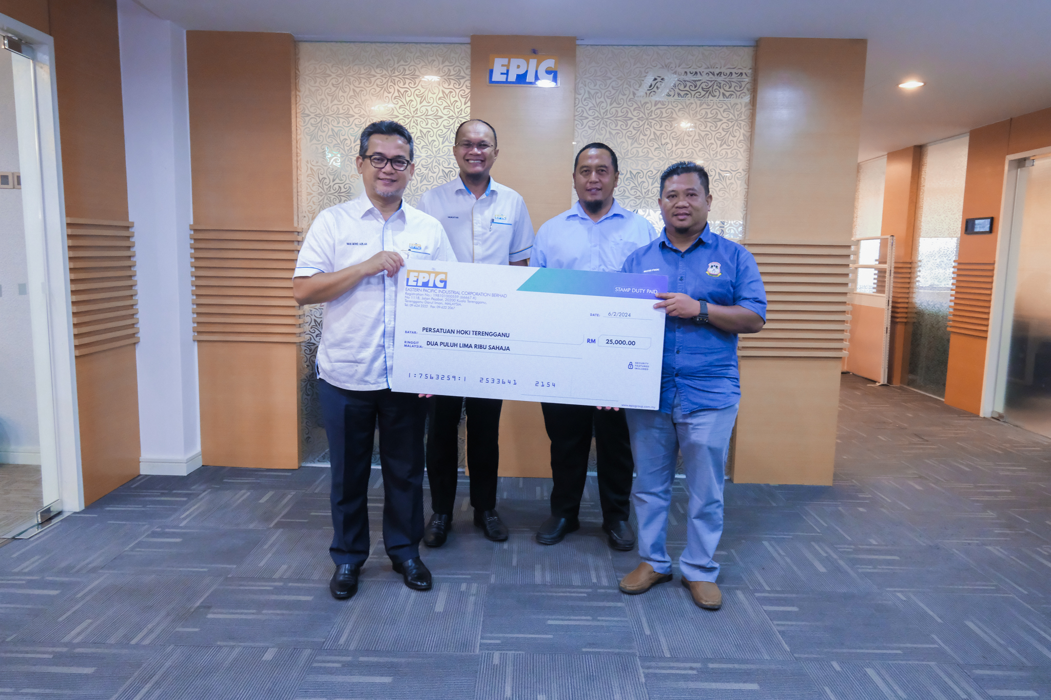 The sponsorship handover session was completed by EPIC Group Chief Operating Officer Haji Muhtar Suhaili to Terengganu Hockey Association (PHT) President Encik Mohd Fikri Harun, in the presence of Kemasik ADUN and PHT Patron YB Ir. Saiful Azmi Suhaili and EPIC Group Chief Financial Officer Encik Wan Mohd Azilah Wan Abdullah in a ceremony held at the EPIC Berhad Corporate Office in Kuala Terengganu.